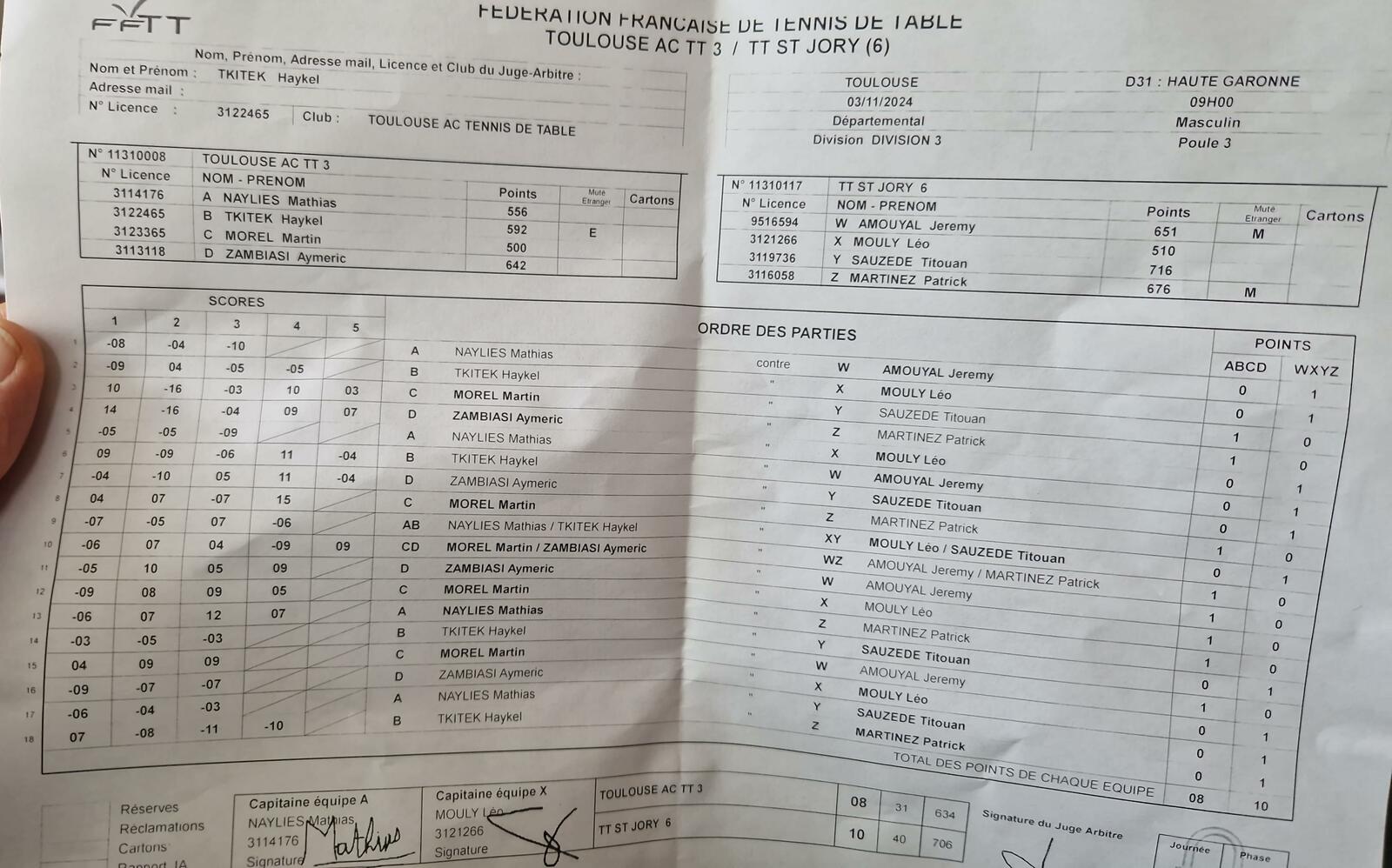 En cette 4eme journée de D3, nous avons joué à domicile et avons recu le TT Saint Jory. Aymeric, Haykel, Mathias et Martin étaient opposés un 7, deux 6 et un 5.